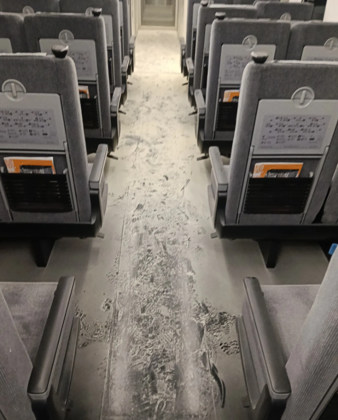 遭旅客噴滅火器的自強號車廂地板蒙上粉層。翻攝畫面