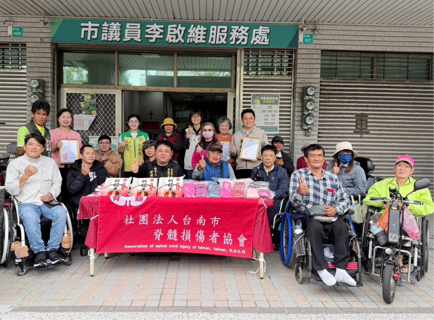 市議員李啟維邀集社會善心人士及熱心企業,共同關心身障者權益,合捐一批物資給台南市脊髓損傷者協會,包括1830公斤白米及8萬元現金等。今(27)日上午11點在安平區李啟維服務處舉行捐贈儀式,社會局身障福利科楊琇評股長、脊髓損傷者協會理事長歐國欽率多位理監事到場代表受贈,並感謝各界以實際行動支持脊髓損傷者在復健、生活重建與社會參與上的需求。