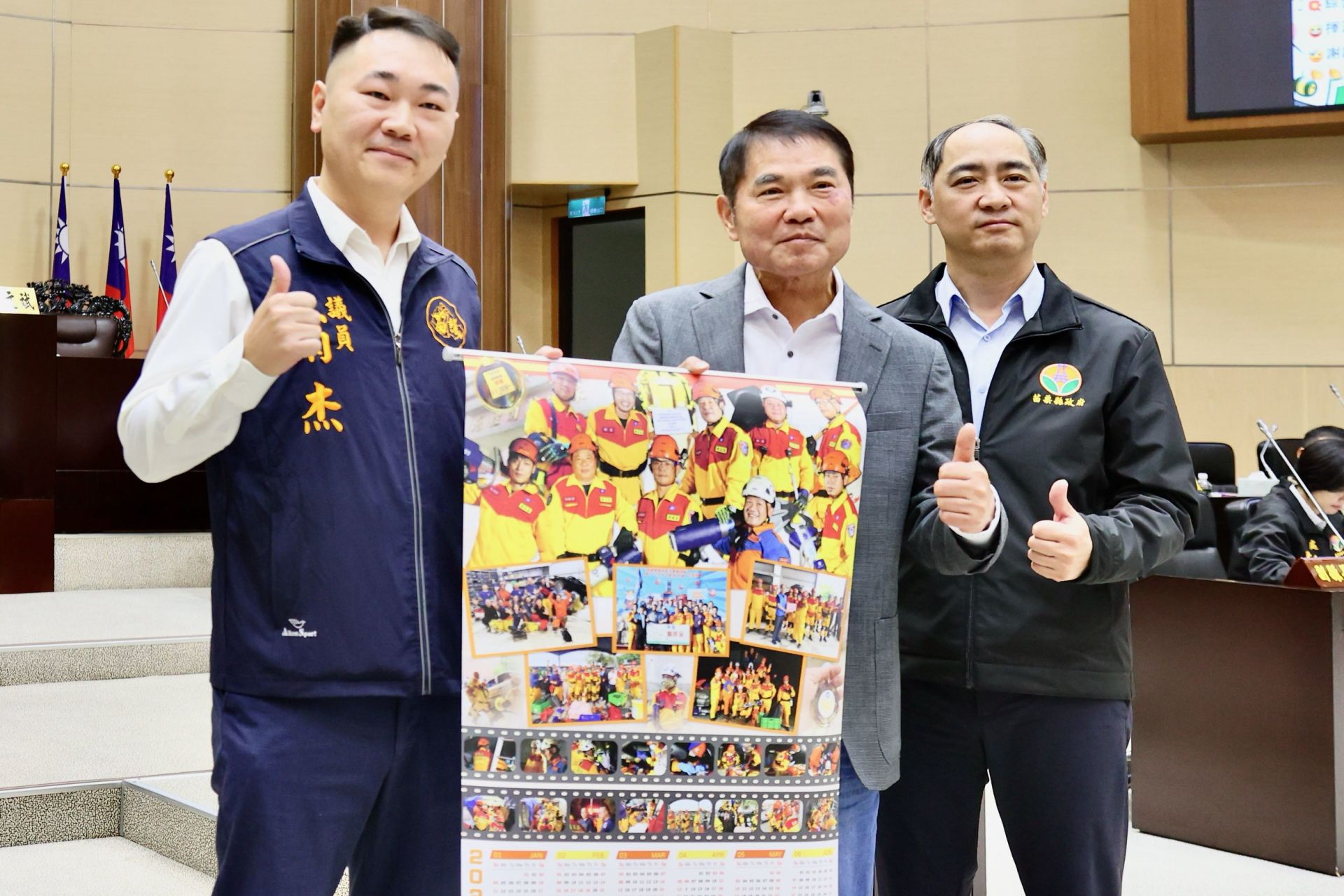 消防議題:翁杰議員於上個會期建議消防局補充相關義消裝備,並請問目前進度,消防局長表示相關裝備今年都已有編入預算,陸續補充當中,此外翁杰議員也對局長肯定在本年度苗栗縣主辦的「全國義消競技大賽」苗栗隊的努力表現!另感謝義消總隊長鍾縣長對於獲得佳績的隊伍額外加碼,最後翁杰議員獻上以隊伍訓練參與其間照片設計的2026獨家年曆給鍾東錦縣長。