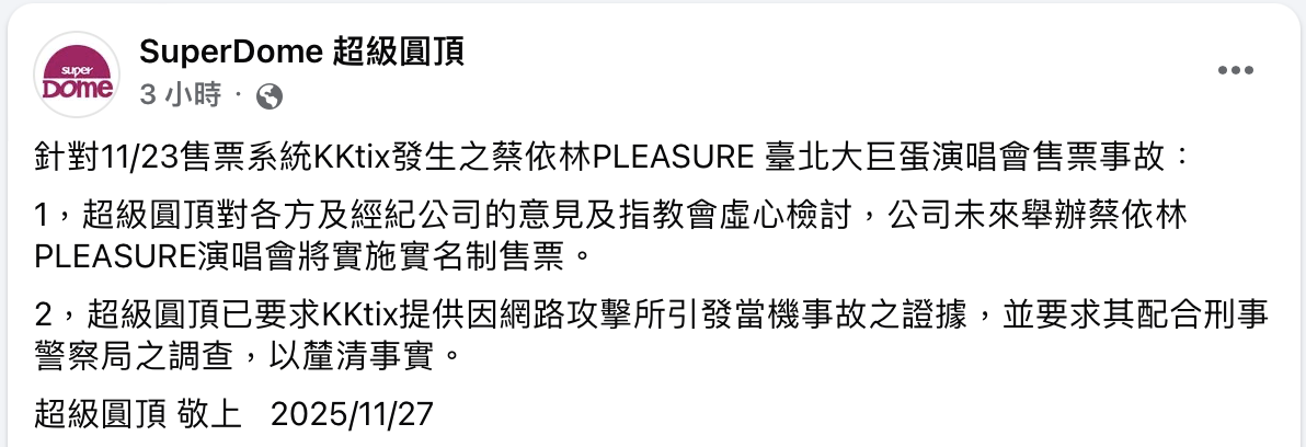 KKTIX 雖於當日下午 17:00 進行清票作業,但仍無法平息粉絲怒火,相關討論在社群平台持續延燒。主辦單位 超級圓頂 今(27日)在臉書發表聲明,針對 KKTIX 當日的售票事故提出兩點說明: