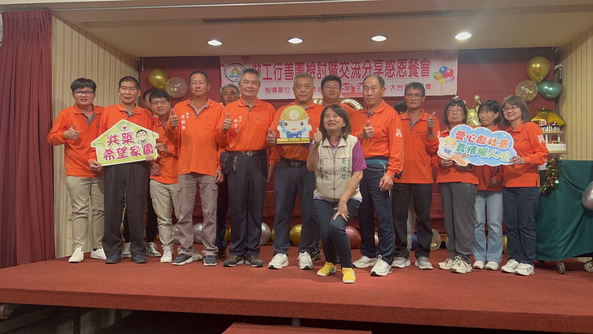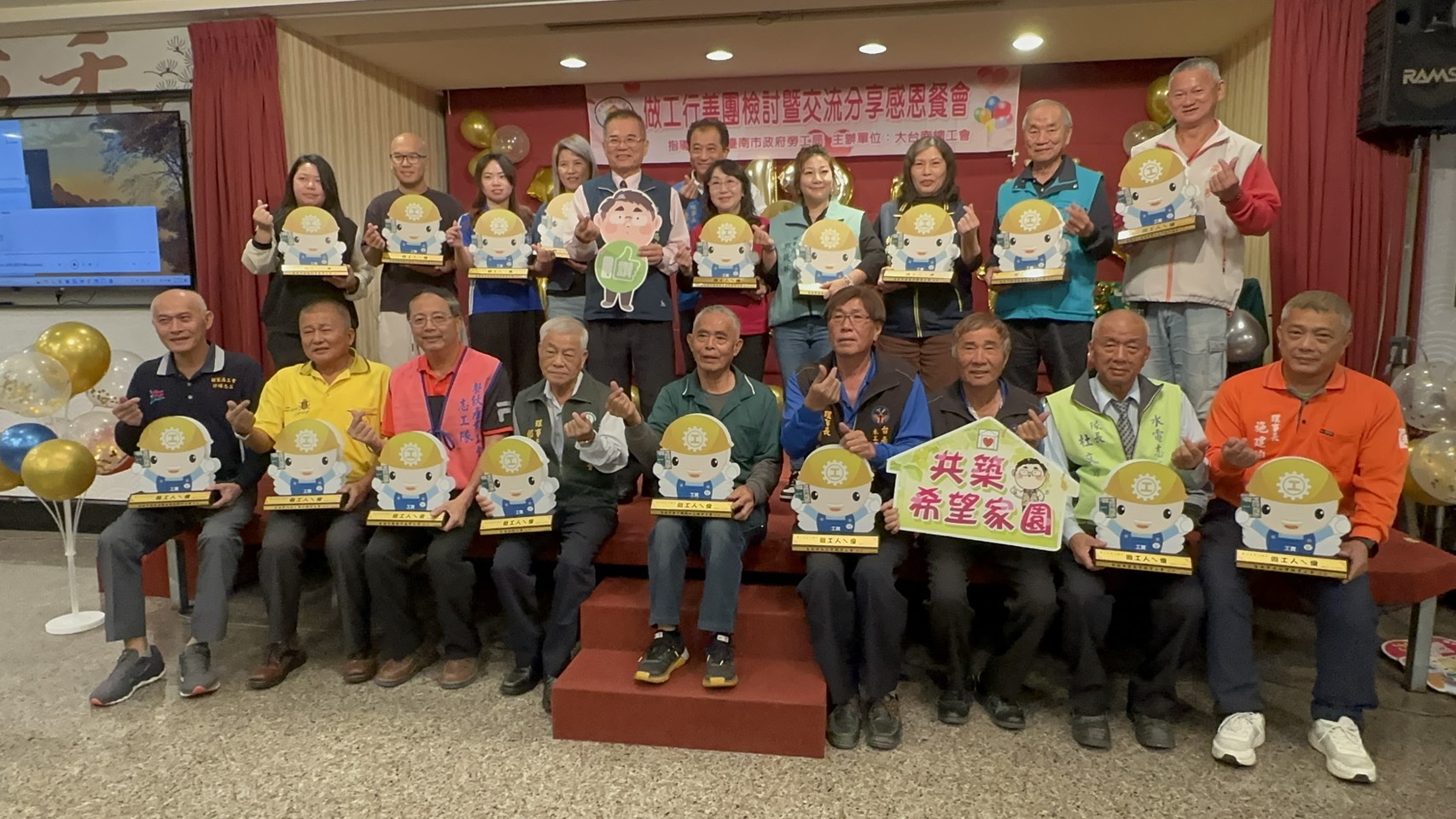 大台南總工會為臺南市政府勞工局推動做工行善計畫,改善弱勢勞工居住環境的主要推手,今(6)日於善化新萬香餐廳舉辦「做工行善團12周年修繕檢討暨交流分享感恩餐會」,邀集各修繕工會及長期投入的志工夥伴齊聚一堂,共同回顧一年來在地震與颱風災後協助弱勢家庭修繕房屋的成果,並頒發感謝狀表揚工會與志工的無私奉獻及感謝在修繕期間「有錢出錢、有力出力」的贊助人士。