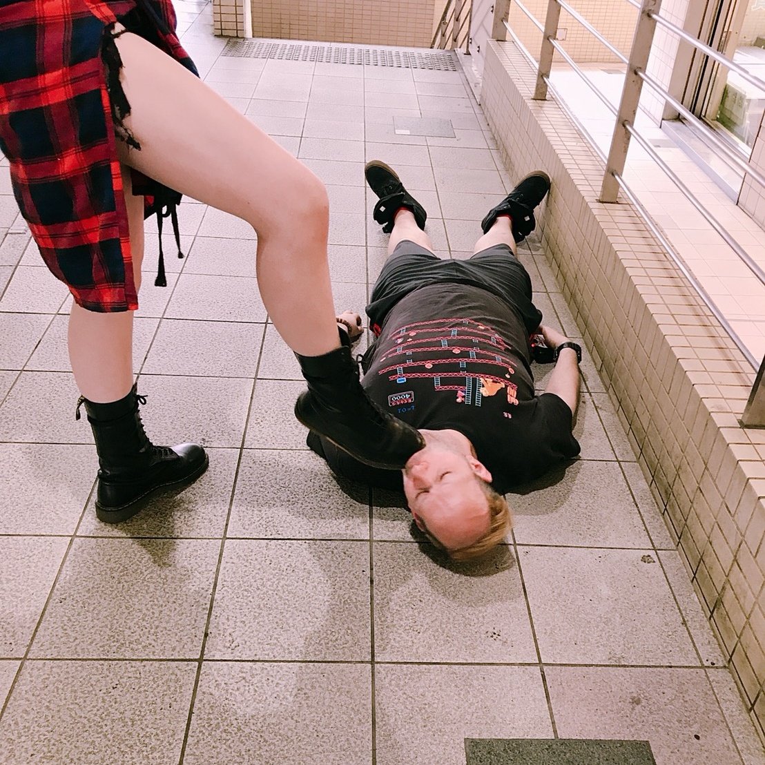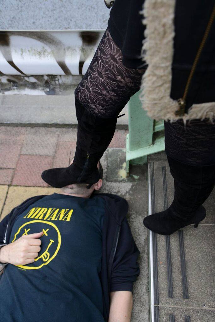 影/最愛被櫻花妹踩!美國男躺路上給短褲女「厚底靴踩臉」 超M行徑全被拍下