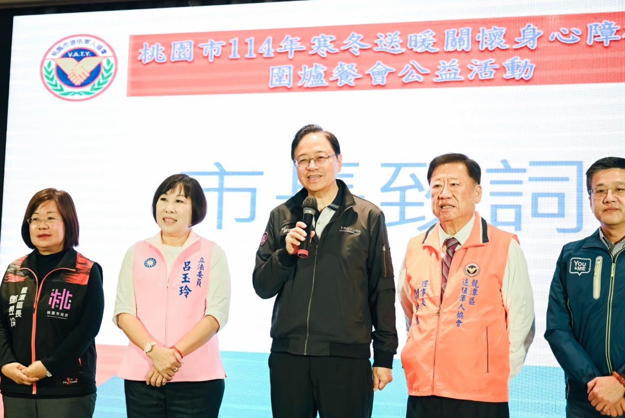 【視傳媒記者袁慧心/桃園報導】桃園市長張善政今(7)日上午前往龍潭區,出席「桃園市114年寒冬送暖關懷身心障礙者圍爐餐會公益活動」。張市長首先感謝龍潭區退伍軍人協會規劃舉辦此次活動,在歲末寒冬之際,藉由集結退伍軍人舉辦餐會,關懷身心障礙朋友,共同打造充滿溫暖與愛的友善桃園。
