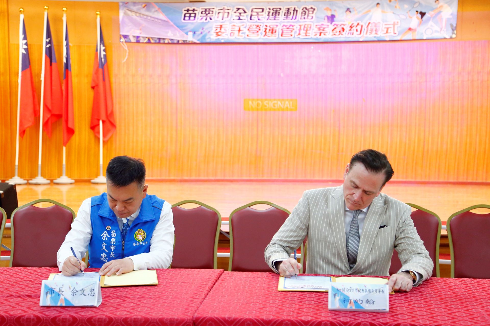 苗栗市公所今(21)日上午於市公所三樓藝文中心舉辦「苗栗市全民運動館」委託營運管理簽約典禮,由苗栗市長余文忠代表市公所,與世界健身事業有限公司(World Gym)董事長柯約翰正式簽署為期9年的營運契約。簽約儀式邀請苗栗縣副縣長邱俐俐、市民代表會主席陳仁杰等貴賓出席,共同見證苗栗市推動全民運動的重要里程碑。
