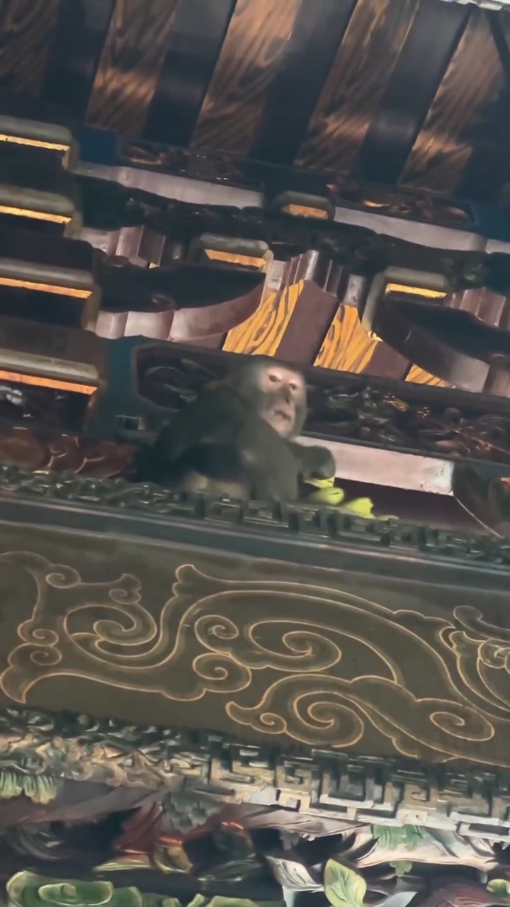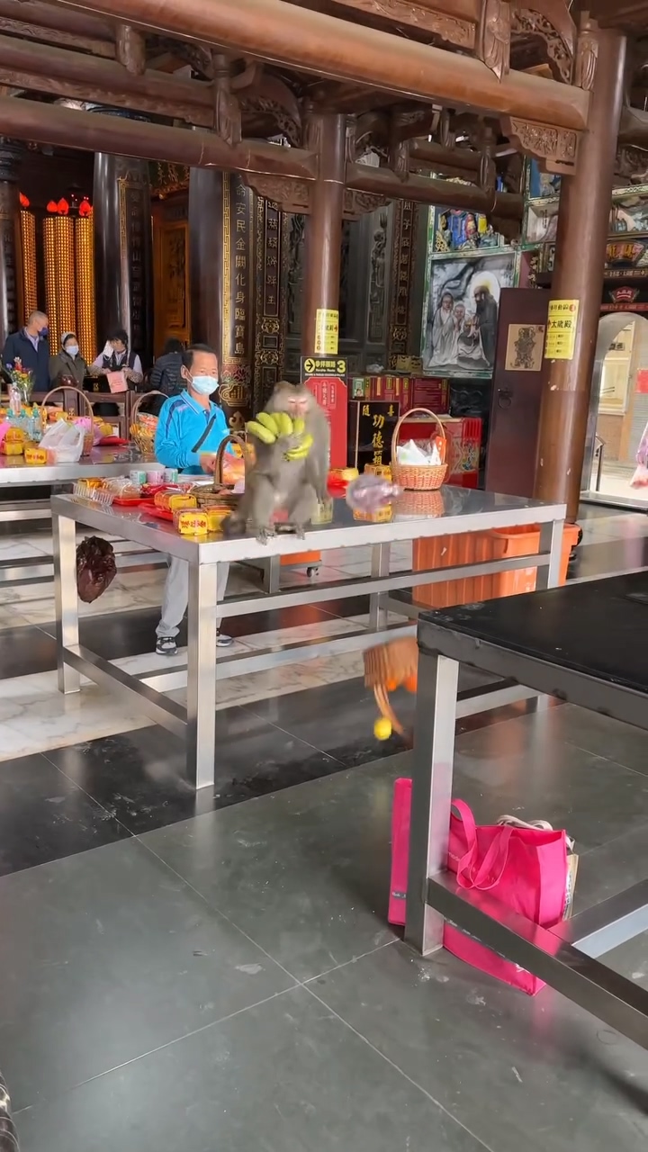 影/警示牌是真的!猴子闖入松柏嶺受天宮突襲供桌 香蕉全拿走躲柱上爽吃