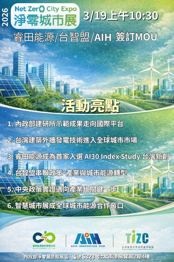 睿田能源股份有限公司宣布,將於 3月19日上午10時30分 在「2026智慧城市展暨淨零城市展」期間,與 Asia Innovation Hub(AIH)及 台灣智慧淨零建築產業聯盟 簽署三方合作意向書(MOU),共同推動淨零建築、立面光電與城市能源治理的應用發展。