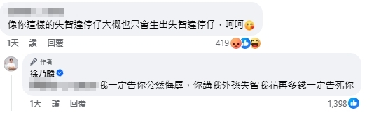 【賴傳媒 林千允/綜合報導】綜藝界大哥徐乃麟,近來因為外孫「夢果」的3歲生日,而在臉書上分享了一張爺孫的甜蜜合影,滿臉幸福微笑,展現了他做外公的無比驕傲與喜悅。然後,這一幕的溫馨卻遭到某些網友的惡語攻擊,令徐乃麟忍無可忍。這位網友不僅挑起徐乃麟過去的違停事件,還用惡言對待他心愛的外孫,「像你這樣的失智違停仔大概也只會生出失智違停仔,呵呵。」這樣的侮辱讓徐乃麟暴怒,連發多條留言回擊,誓言:「你在天涯海角我都會找到你,我絕對不會放過你,一定告死你」