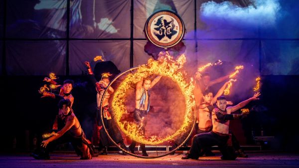 活動當日首先登場的「神劍藝術」以東方武俠為核心,融合LED光影與程式燈光技術,呈現跨界特技劇《劍鈴幻影:雙俠問道》,展現動作美學與哲理意象的完美結合;而「即將成真火舞團」則以火焰與節奏打造磅礡大秀《焰環行者:時空裂縫的召喚》,火光在夜空中飛舞,象徵高雄港灣的熱力與能量,為星光水岸揭開耀眼的序幕。