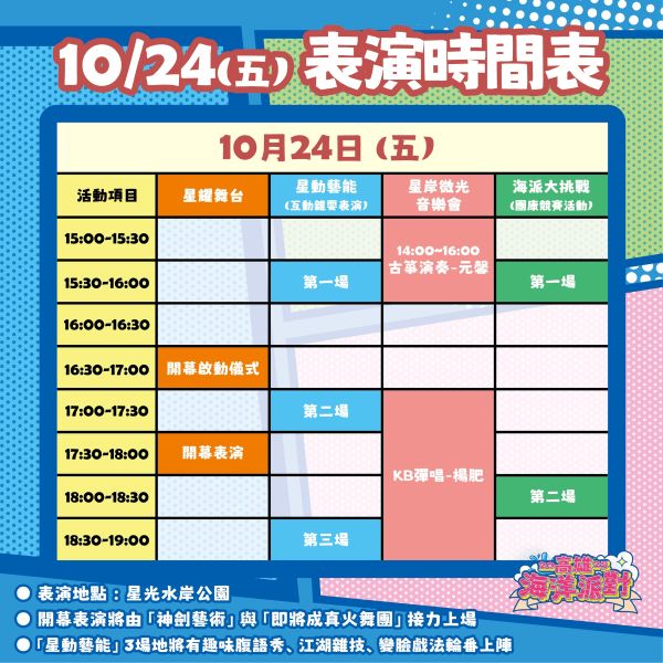 除了開幕表演外,亦安排多場親子與街頭表演,讓園區內各角落都熱鬧不斷!「星耀舞台」化身奇幻親子樂園,現場演員不僅會走下舞台與觀眾同樂,還有任務橋段讓孩子參與,歡笑聲不絕於耳,成為親子共遊的亮點節目;「星動藝能」集結氣球小丑、泡泡秀、腹語魔術、扯鈴雜技等各種互動雜耍表演,讓民眾隨處都能遇見驚喜;熱力滿滿的「海派大挑戰」,由主持人帶領親子組隊挑戰水中律動、鴻運滾滾來、默契大考驗等趣味競賽,讓歡笑與水花交織成最熱情的派對現場;「微光音樂會」隨海風登場,實力派駐唱歌手與樂團輪番演出,在閃爍星光與波光夜色中,為民眾獻上最Chill的音樂時光。